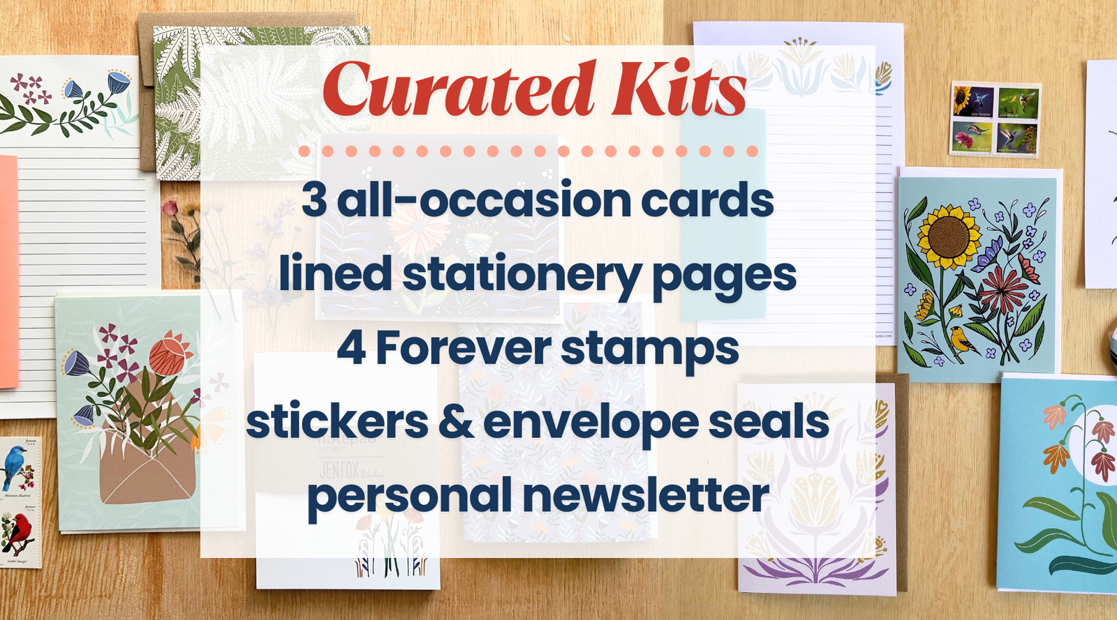Kits include: materials to write four cards or letters (a mix of greeting cards, notecards, and stationery sheets + envelopes), coordinating stickers, 4 forever stamps, and a personal newsletter from Jen. Plus, digital downloadable copies of stationery writing sheets so you can print more at home.